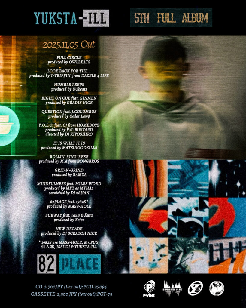 東海エリアのクルー「RC SLUM」に所属し、同世代コレクティヴ「1982S」にも名を連ねる三重県鈴鹿市在住のラッパー、YUKSTA-ILL。地元をベースに長きに渡ってヒップホップ・シーンで活躍し、近年ではMCバトルのシーンにも復帰して絶妙なバランス感覚で界隈でも活動しており、2023年には自身のプロダクション「WAVELENGTH PLANT」を設立したことも大きな話題となったが、約2年半ぶりの通算5枚目となる待望のニューアルバム『82PLACE』のジャケット、トラックリストが公開!